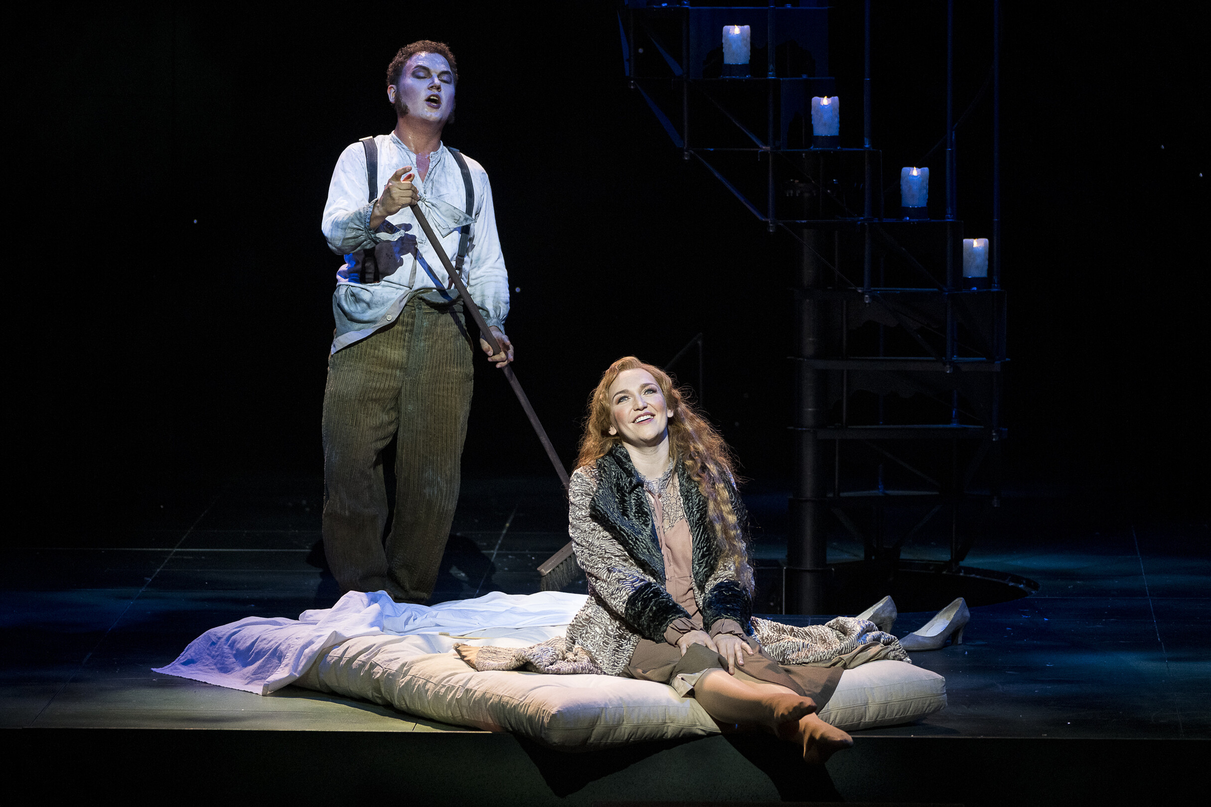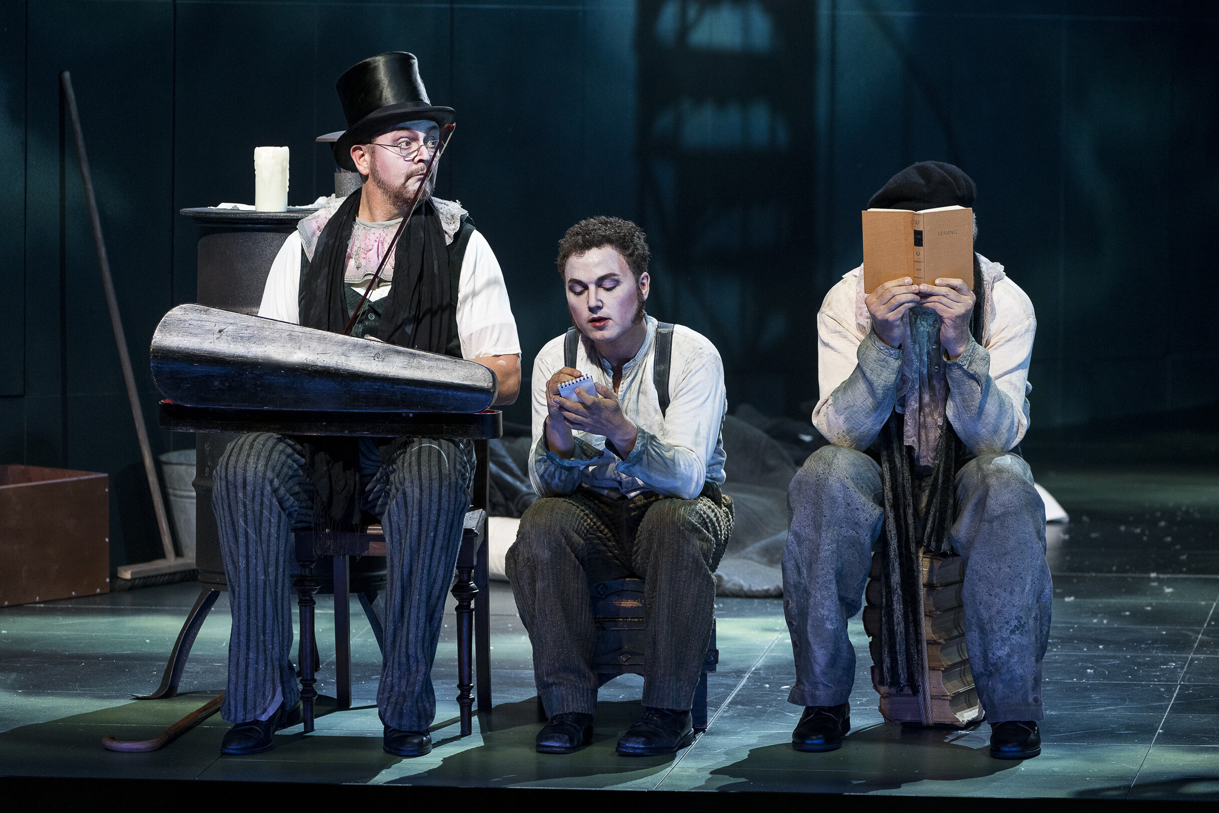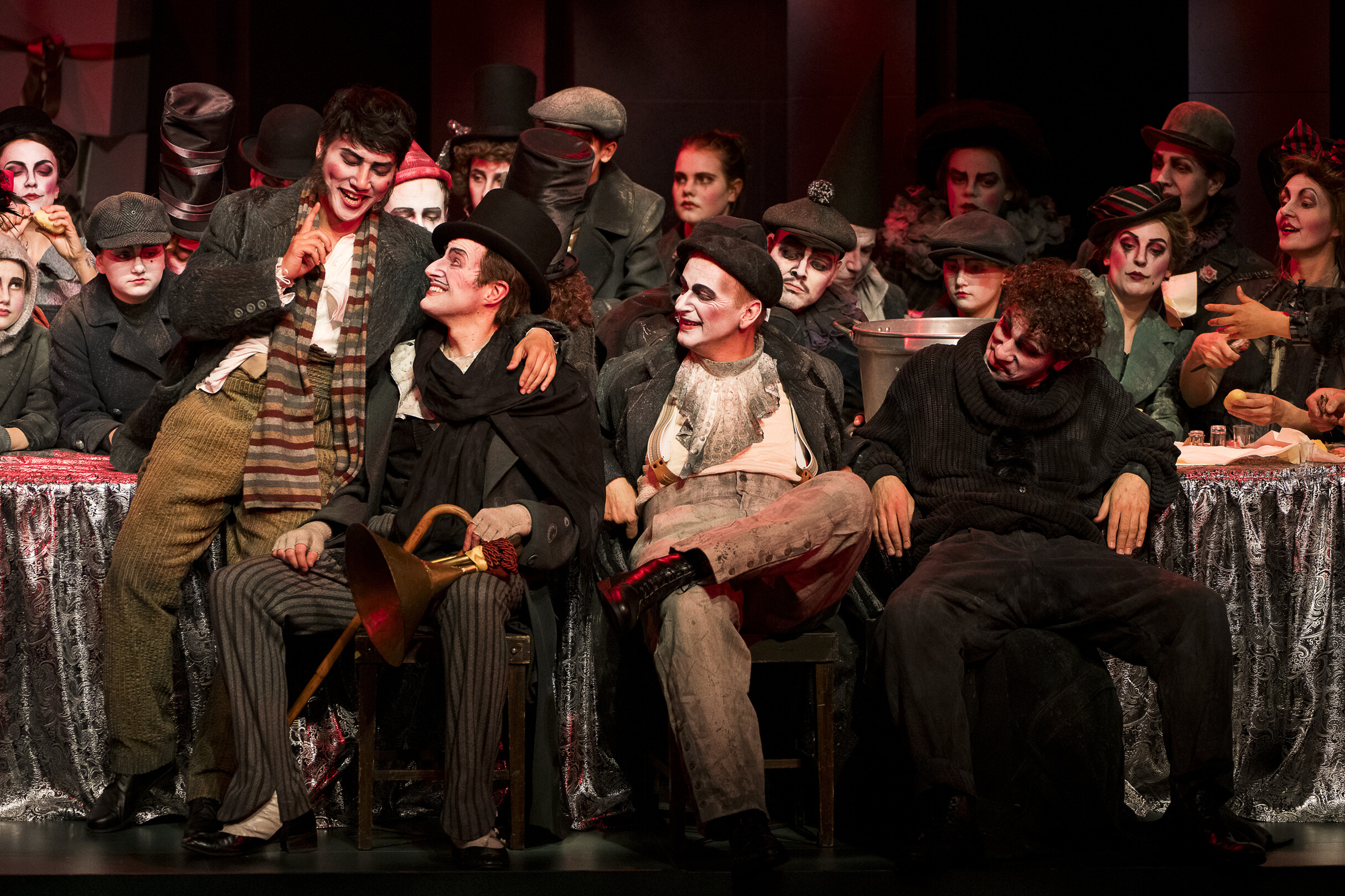 In their garret high above Paris, the artist friends Rodolfo, Marcello and Colline are suffering from the winter cold. Schaunard’s appearance changes the mood: he tells them about a profitable job as a musician that supposedly provided him with money and food. The landlord Benoît breaks into the bohemians’ revelry to collect the overdue rent. Using a trick, the friends manage not only to avoid paying the rent, but to steal from Benoît. Together they set off to celebrate the special evening. Only Rodolfo stays behind at first, pretending to have an article to finish. Under the pretence of needing a light for her candle, Mimì knocks on Rodolfo’s door. The two grow closer as they discuss their respective dreams and desires.