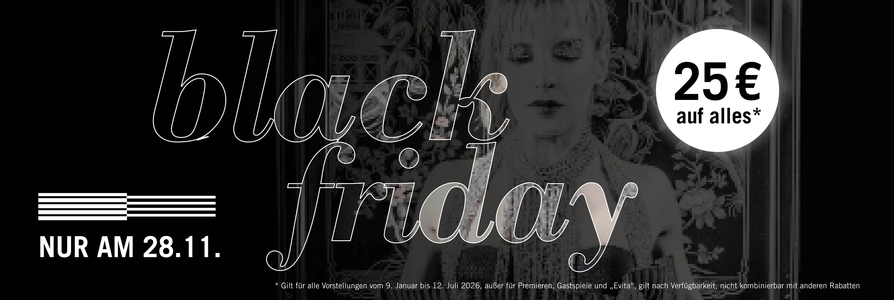 Nur an diesem Tag gibt’s Tickets für die Staatsoperette zum einmaligen Black Friday Preis von 25 € – quer durchs gesamte Repertoire! Ob Operette, Oper oder Musical – wählt aus 11 Inszenierungen und erlebt unvergessliche Abende im Kraftwerk Mitte. Gilt nur online für Vorstellungen vom 9. Januar bis 12. Juli 2025 (außer Premieren, Gastspiele & Evita).